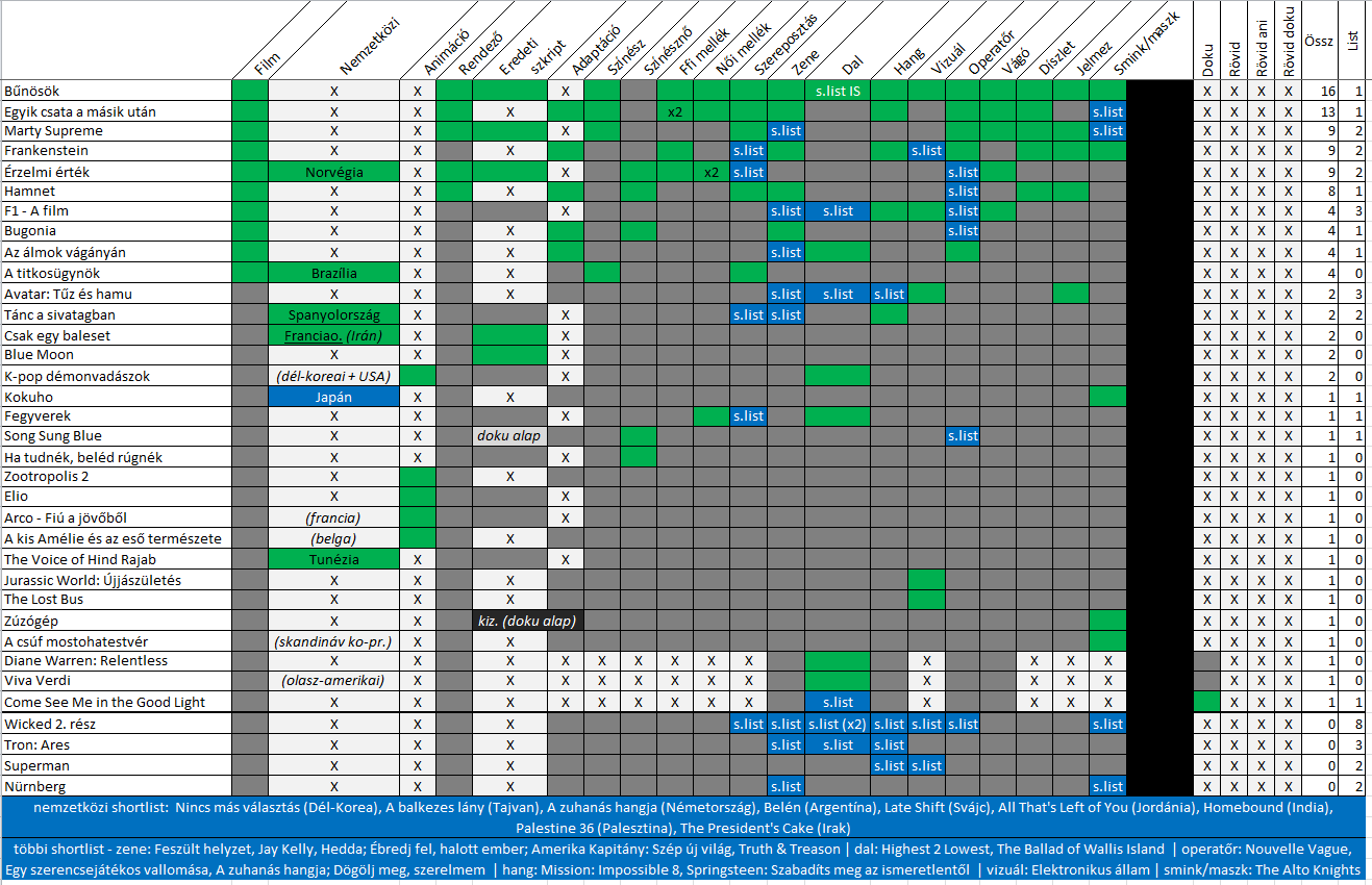 13 – One Battle After Another / Egyik csata a másik után (12 kategória: film, rendező, adaptáció, színész, ffi mellék x2, női mellék, casting, zene, hang, operatőr, vágó, díszlet)